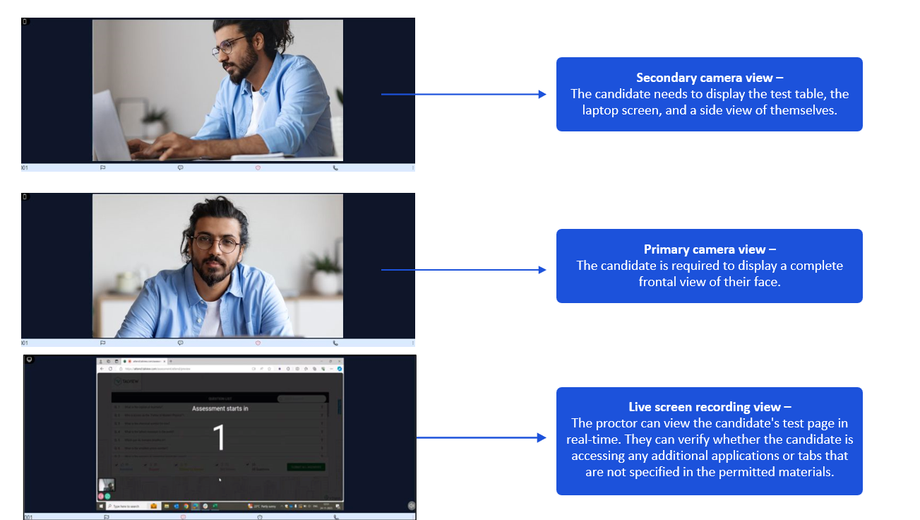 - Camera Feeds: Proctors monitor the Primary camera (frontal view of the face) and the Secondary camera (which must show the test table, laptop screen, and a side view of the candidate).