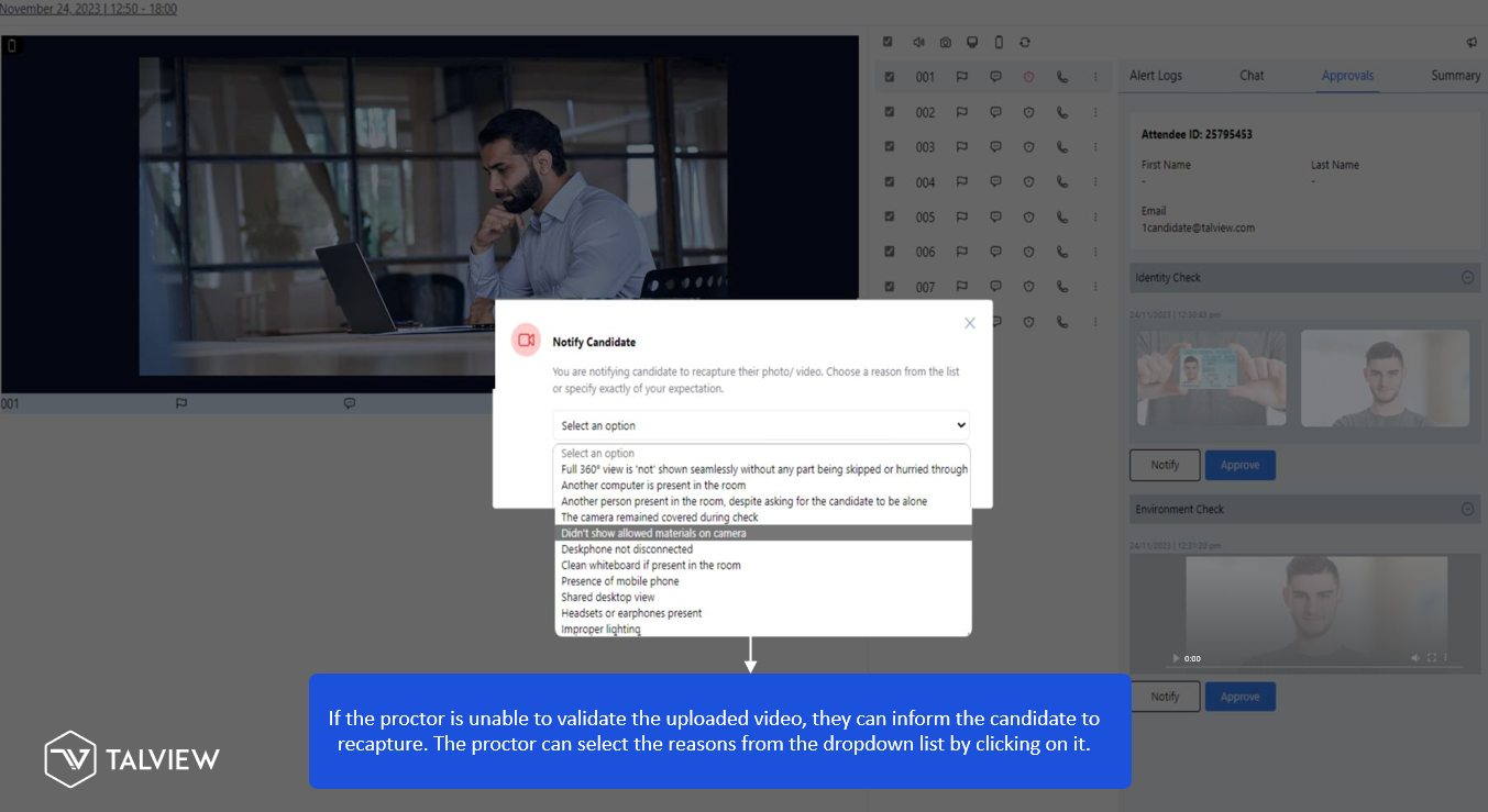 - Notification/Rejection: If the pre-checks are invalid (e.g., blurry photo, invalid ID, or poor lighting), the proctor clicks the "Notify" button. They can select specific reasons from a dropdown menu to inform the candidate to retake the photo or video.